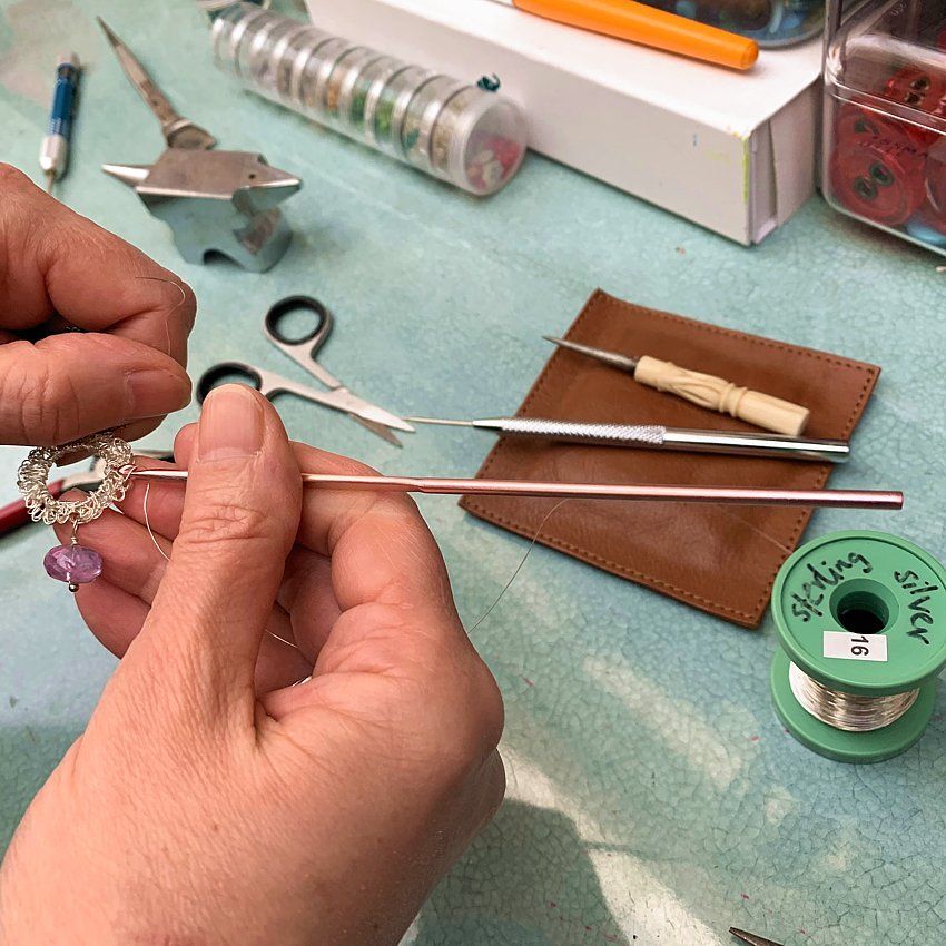 While layers of collage and paint dry, I sit at my workbench to design and hand crochet sterling silver jewellery.